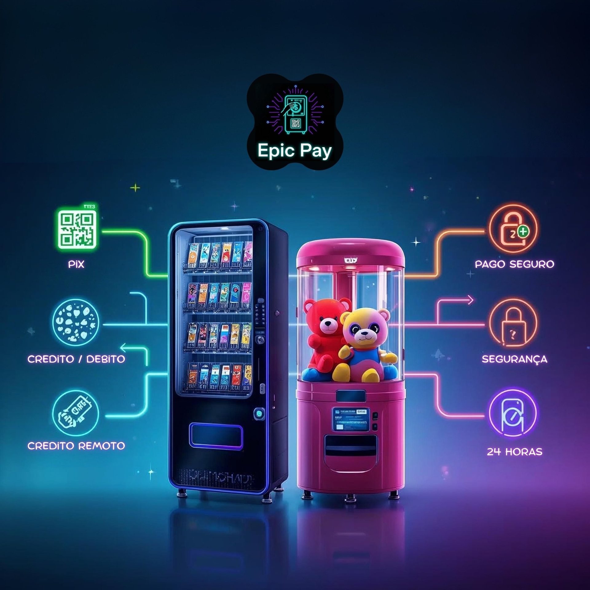 Entre na revolução dos pagamentos com a Epic Pay Pix, a solução completa de software e hardware personalizada para vending machines e máquinas de garra de pelúcia. Transforme seu negócio com tecnologia avançada, sua marca em destaque e lucros garantidos!